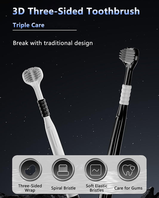 Plexaris 3-Sided Toothbrush for Adults (2-Pack, Soft Bristles with Tongue Cleaner)