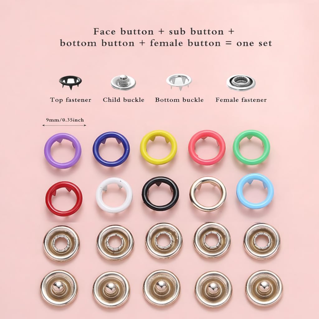 - COMPLETE BUTTON PLIER TOOL KIT – This set includes 100 silver buttons, 100 colorful rings, and a reliable hand pressure plier for seamless button application. The button pressing machine is simple to use, making it easy to fix buttons on any fabri